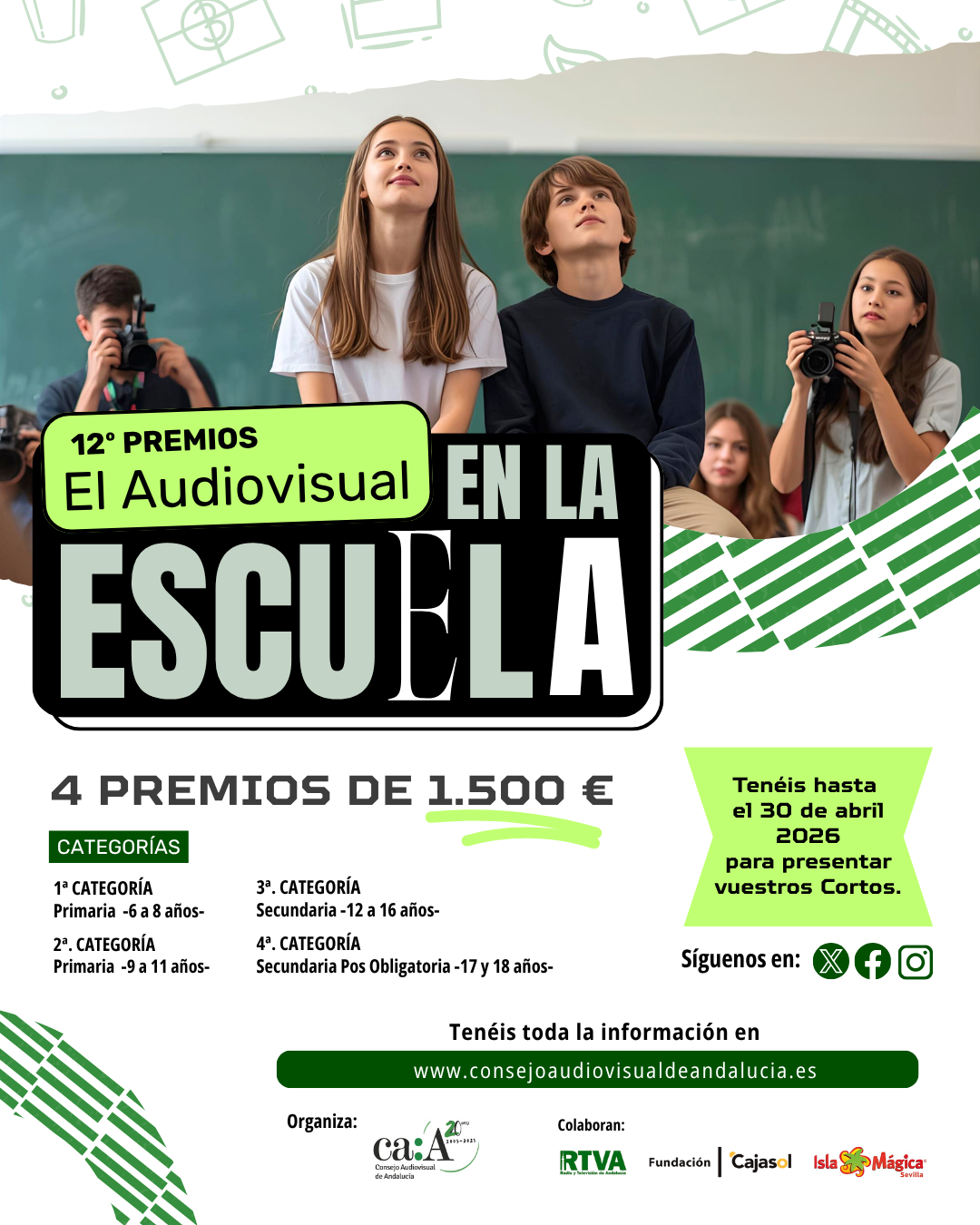 El Consejo Audiovisual de Andalucía (CAA) convoca un año más este concurso escolar cuyo objetivo es reforzar las competencias en comunicación audiovisual en el aula de los centros educativos de Andalucía. El uso habitual de los dispositivos que permiten asomarse a las pantallas conectadas a Internet se ha consolidado como un elemento clave en la socialización de los más jóvenes, en su desarrollo personal y en la configuración de sus hábitos de consumo. Por ello, los Premios Andaluces «El Audiovisual en la Escuela» tienen como objeto fomentar la alfabetización mediática en los centros docentes andaluces.